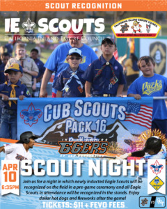 « All Events Scout Nights with The Inland Empire 66ers April 10 @ 6:35 pm - 9:00 pm The Merit Badge Academy at Camp Emerson » GET TICKETS: Scouting America Add to calendar Google Calendar iCalendar Outlook 365 Outlook Live Details Date: April 10 Time: 6:35 pm - 9:00 pm Venue San Manuel Stadium 280 S E Street San Bernadino, 92401 United States + Google Map